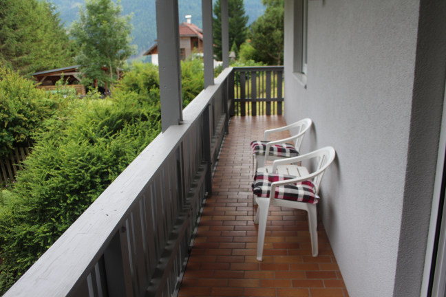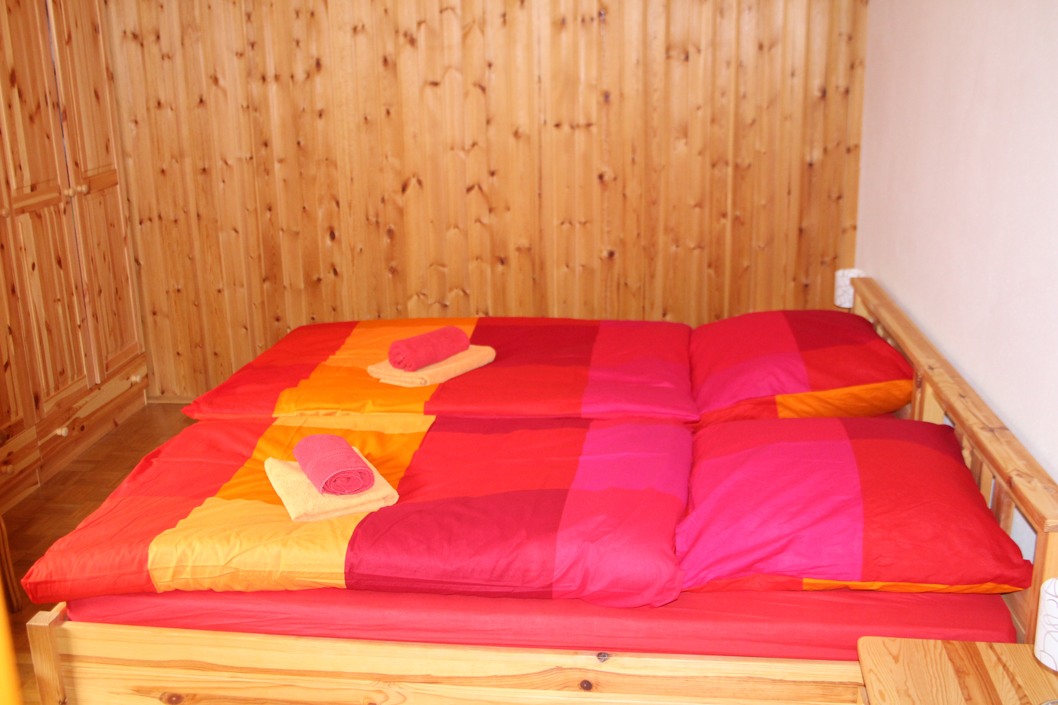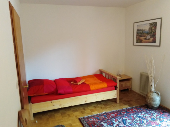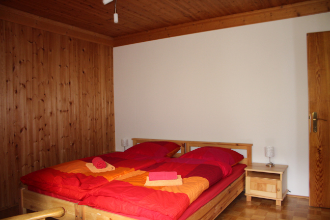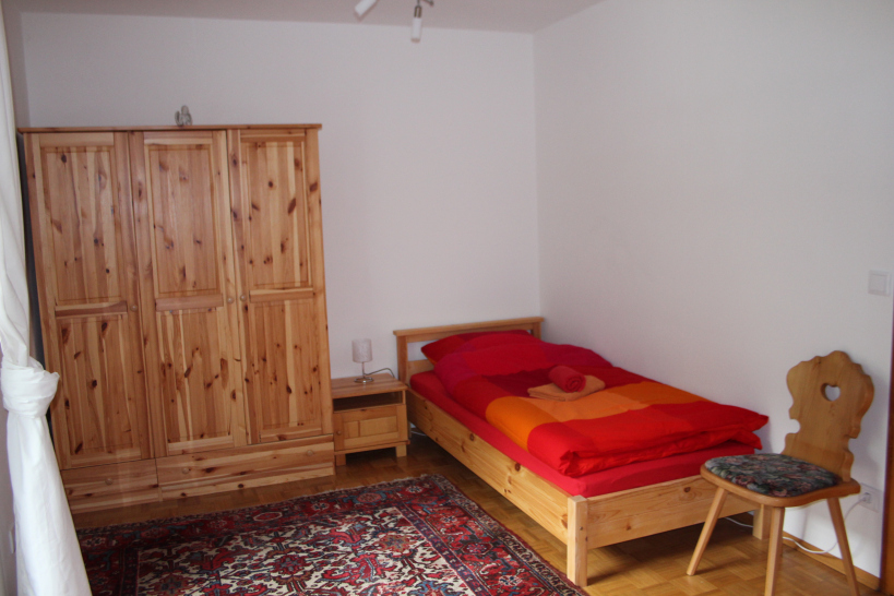 Dieses Zimmer bietet zwei Enzelbetten (90x200cm) ohne Fußteil die zusammen gestellt oder auch als Einzelbetten genutzt werden können. Es gibt einen Holzschrank für die Kleidung und 2 Sessel. Der Blick aus dem Fenster geht auf den Hang hinter dem Haus. Es ist daher sehr ruhig gelegen.