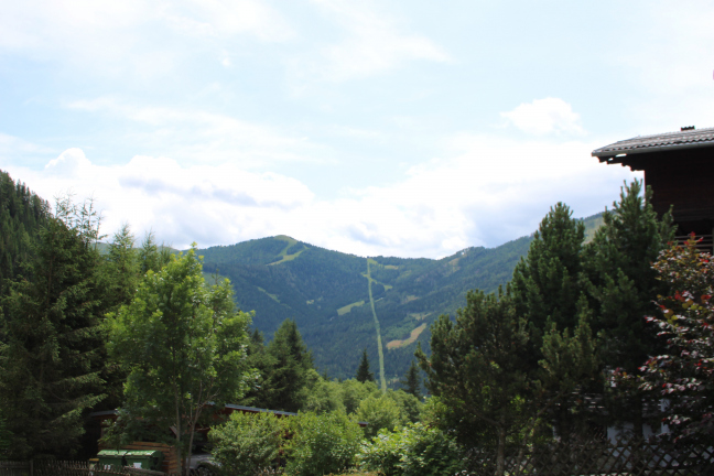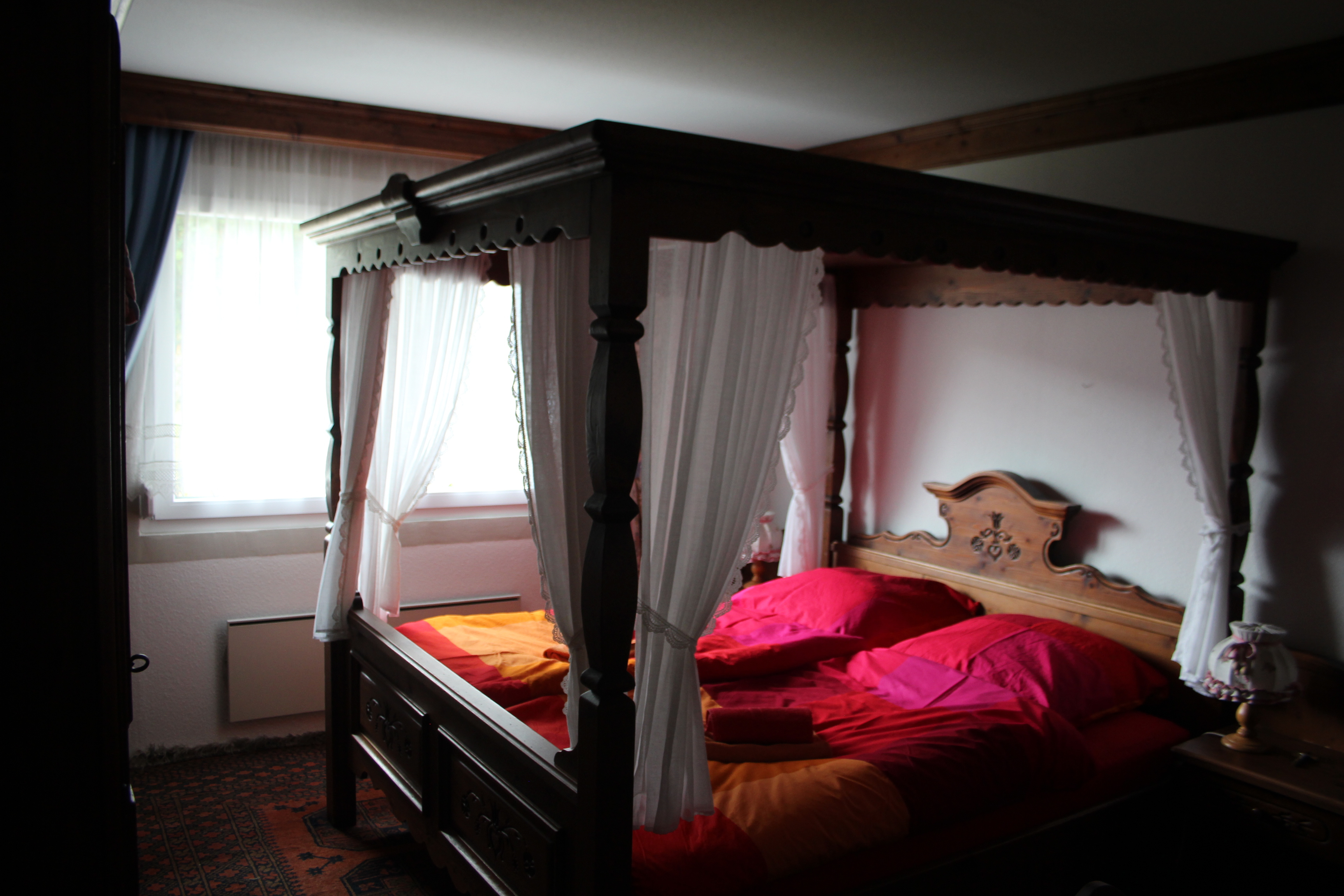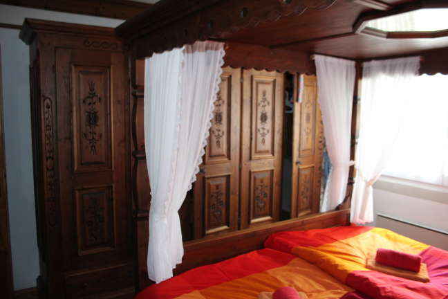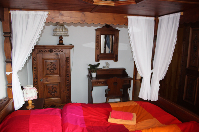 Diese Zimmer bietet ein großes Doppelbett (180x200cm) als Himmlebett ausgeführt, einen großen Schrank und einen kleinen Schreibtisch (Sekretär). Das ganze ist in dunklem Holz ausgeführt. Der Blick aus dem Fenster geht über die Terasse hinweg auf die umliegenden Berge.