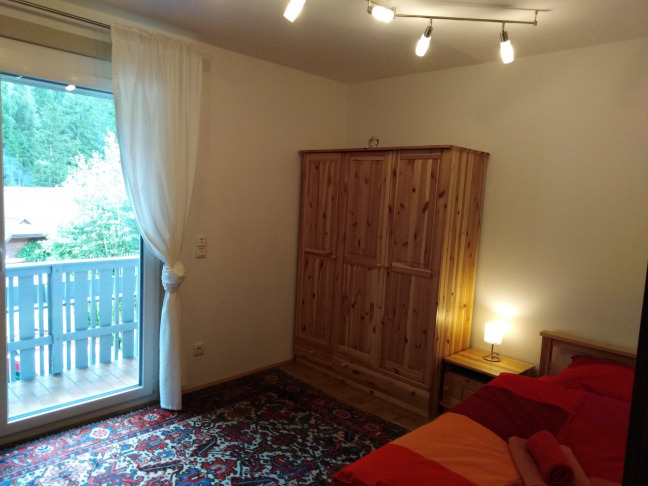 Diese Zimmer bietet ein großes Doppelbett (180x200cm) als Himmlebett ausgeführt, einen großen Schrank und einen kleinen Schreibtisch (Sekretär). Das ganze ist in dunklem Holz ausgeführt. Der Blick aus dem Fenster geht über die Terasse hinweg auf die umliegenden Berge.