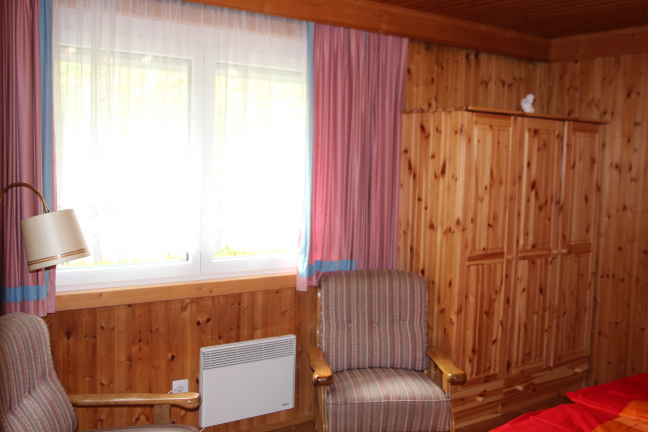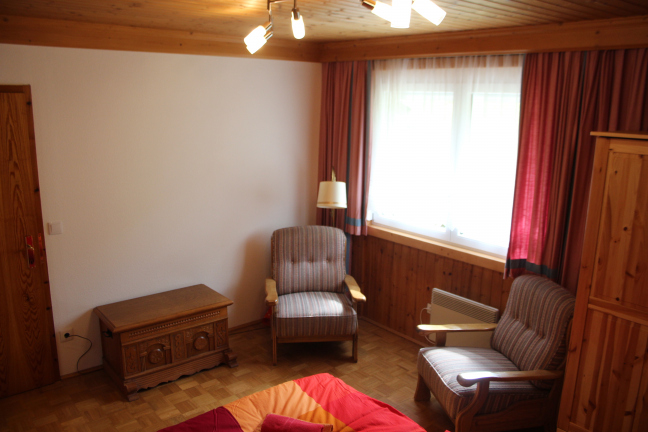 Dieses Zimmer bietet zwei Enzelbetten (90x200cm) ohne Fußteil die zusammen gestellt oder auch als Einzelbetten genutzt werden können. Es gibt einen Holzschrank für die Kleidung und 2 Sessel. Der Blick aus dem Fenster geht auf den Hang hinter dem Haus. Es ist daher sehr ruhig gelegen.